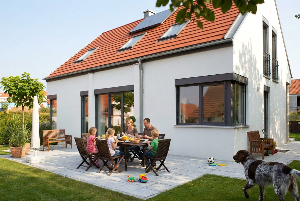 Ein bestehendes Immobilienfoto wurde dezent mit "Leben" gefüllt, ohne den Charakter des Gebäudes und der Situation zu verändern.